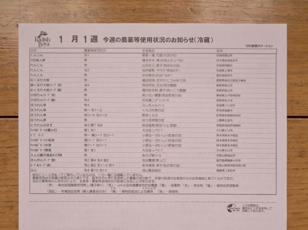 しかしながら、企業としては創業当初から「反農薬」の姿勢を続けていて、農薬の使用は「必要最小限」という事を掲げています。メリットに書いた通り、配送された野菜の農薬使用状況は公開されているので、気になる方はチェックができて安心だと思います。