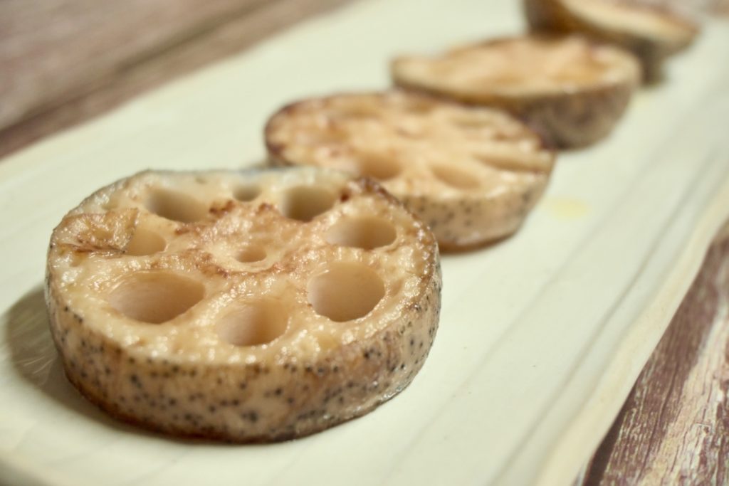 油を引いたフライパンに2cmほどの厚さに切ったれんこんを乗せてじっくりソテー。
